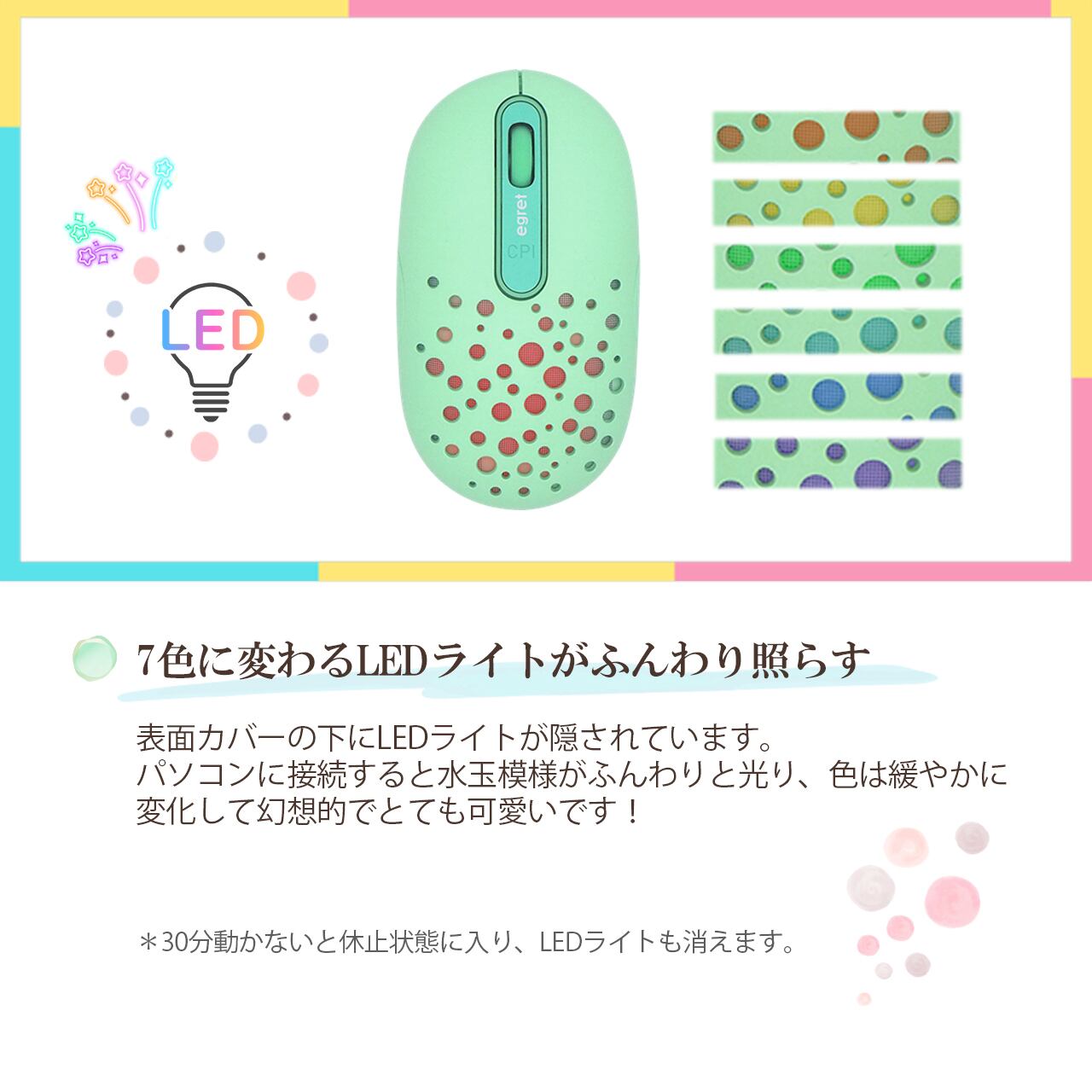 EGRETマウスHappiEコーラルは、快適で正確なPC操作を実現しながら、女性らしいサーモンピンクと可愛い水玉模様でデスク周りをぱっ明るくしてくれます。7色に変わるLEDライトは水玉模様をふんわり照らし、エネルギーと元気をチャージしましょう!