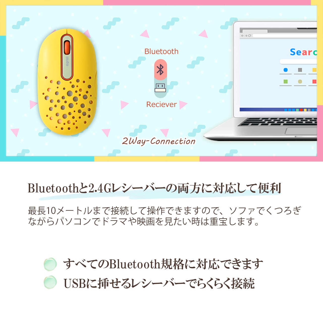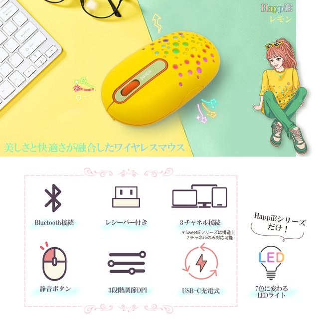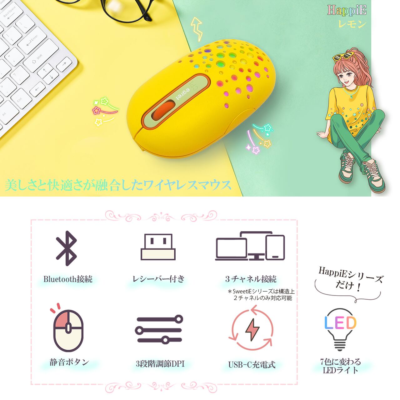 EGRET Bluetooth5.0/3.0/2.4G 3モード対応、色変わるLEDライト内蔵、充電式無線マウス(HappiEレモン)